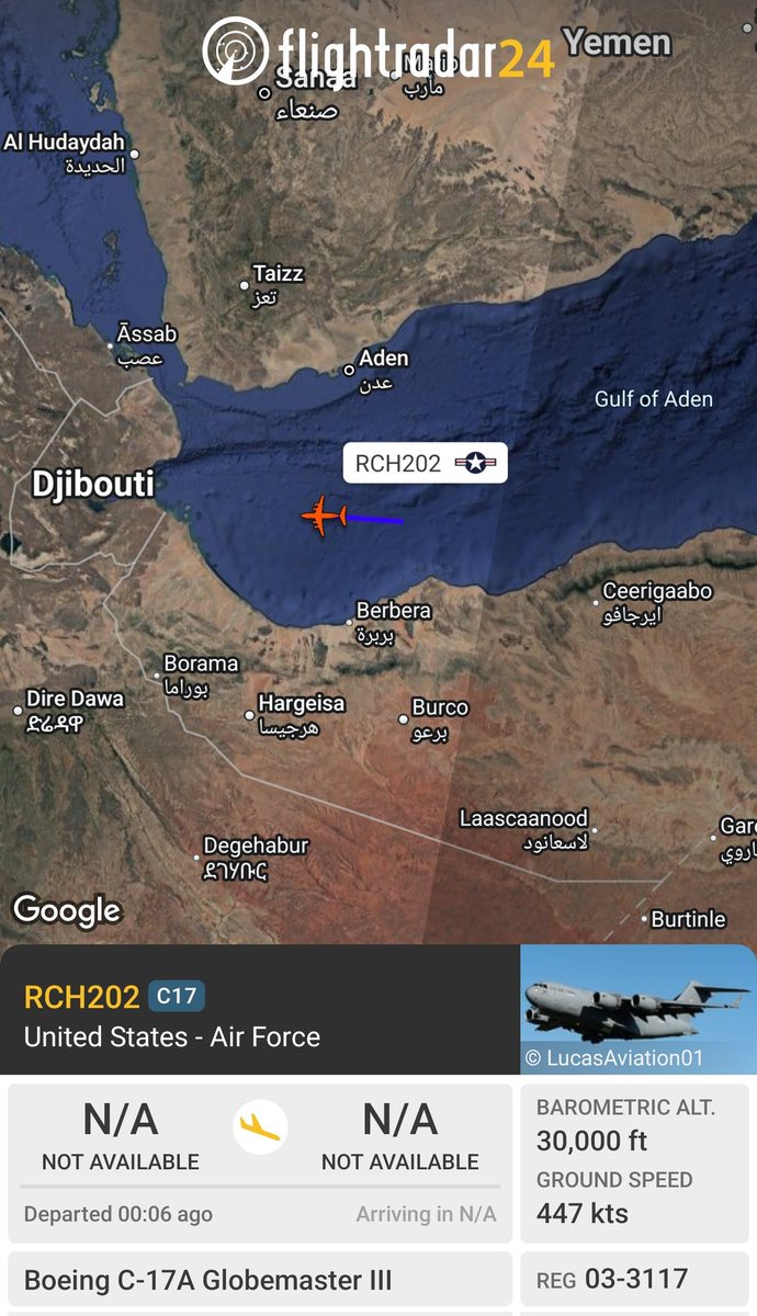 A United States Air Force C-17A Globemaster III conducted a flight from Diego Garcia (British Indian Ocean Territory) to Djibouti, as posted on Twitter.