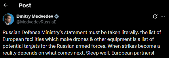 Russia's Medvedev: Russian Defense Ministry’s statement must be taken literally: the list of European facilities which make drones & other equipment is a list of potential targets for the Russian armed forces. When strikes become a reality depends on what comes next. Sleep https://t.co/Zf0YKJZ5p4