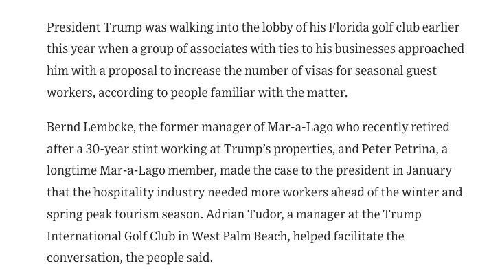 President Trump directed his administration to increase the allotment of H‑2B temporary work visas after lobbying from associates tied to his private clubs. The Wall Street Journal identified former Mar‑a‑Lago manager Bernd Lembcke and longtime member Peter Petrina as the key figures who made the case to the president. Their advocacy contributed to the reversal of the administration’s earlier plan to cut the visa program. The expanded visas will allow additional seasonal guest workers to enter the United States.