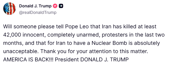 President Donald Trump has reiterated his criticisms of Pope Leo and stated it is completely unacceptable for Iran to have a nuclear bomb. This follows his recent public comments where he claimed Iran has killed at least 42,000 innocent and unarmed protesters in the last two months. The statement, posted on social media, comes amid ongoing US-Iran tensions and a naval blockade of Iranian ports. The claims about protest deaths are unverified and have been a recurring theme in Trump's rhetoric.