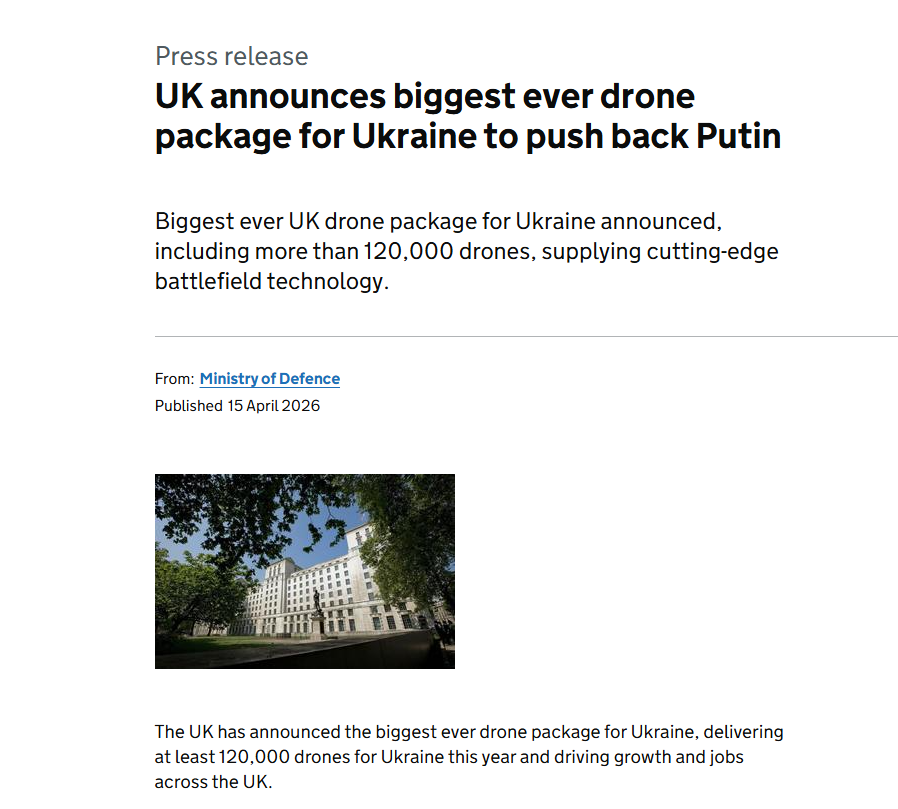 The UK government confirms shipments of the pledged drones have already begun in April 2026.