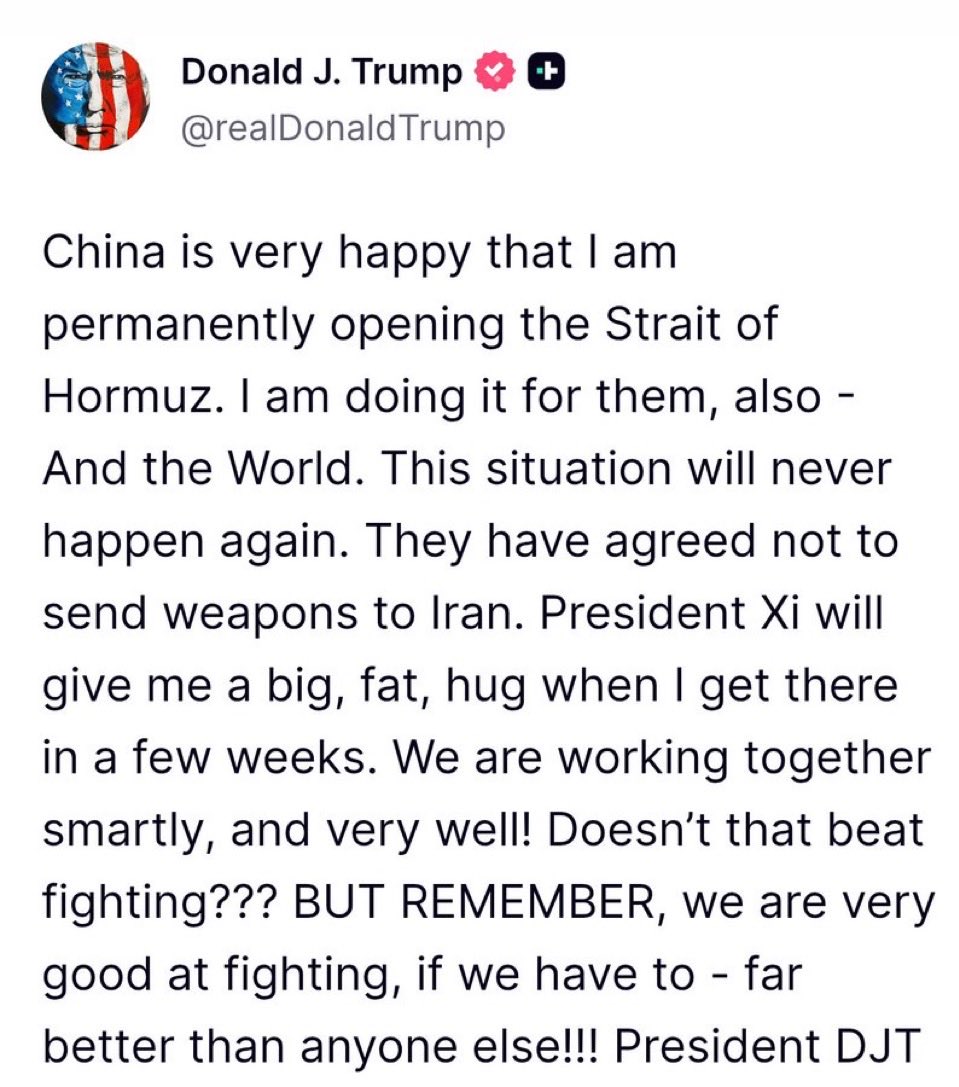 President Donald Trump has repeated his claim that China agreed not to send weapons to Iran, stating he is 'permanently opening' the Strait of Hormuz for China and the world. He said President Xi Jinping will give him a 'big, strong hug' when he visits China in a few weeks, framing the move as a result of smart cooperation. Trump emphasized that the situation of a blockade 'will never happen again' but also warned the US is 'very good at fighting' if necessary. The statement continues to blend a claim of diplomatic progress with a reminder of military readiness.