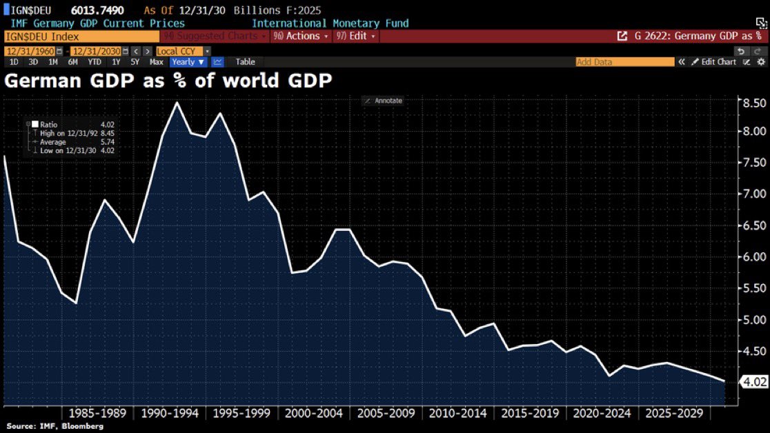 A new economic forecast projects Germany's share of global GDP will decline to 4% by 2030. This would mark the country's lowest relative economic weight in at least 50 years. The data highlights a significant long-term shift in the global economic landscape, with Germany's influence waning compared to faster-growing economies.
